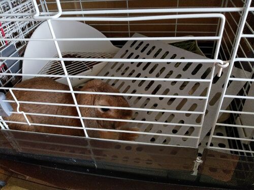 最近スゴく忙しくて、エサをあげる以外はかまっていなかった。ある日突然ウサギがキレた! スノコを放り投げ暴れる暴れる。 自分のスペースが狭くなり隅っこでじっとするしかないウサギ。仕方ないから少しだけうさんぽさせました。